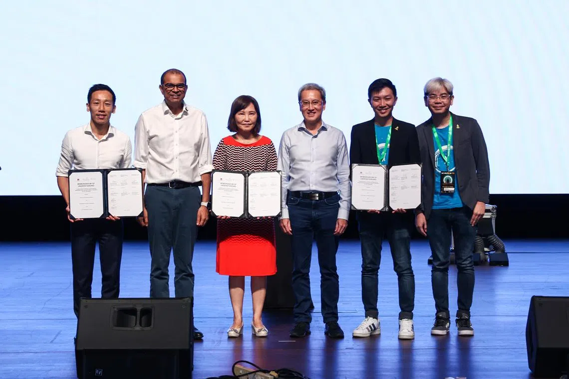 (From left) CEO of Quantedge Foundation Xie Yao Quan, Senior Minister of State for Education Janil Puthucheary, CEO of ITE Low Khah Gek, chairman of ITE Andrew Chong, and the executive directors of The Astronauts Collective Wong Yi Fong and Marvin Kang during the MOU Signing between ITE, Quantedge Foundation and The Astronauts Collective.