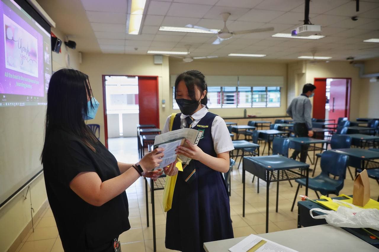 New Town Primary School pupil Livia Ong receiving her PSLE results from her teacher, Ms Chia Kim Fung, on Nov 24, 2021.