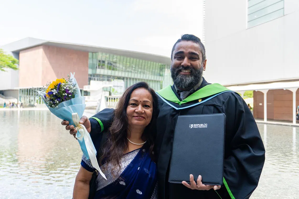 Mr Anil Raj, pictured here with his mother, earned a diploma in engineering design with business from Republic Polytechnic in 2025.