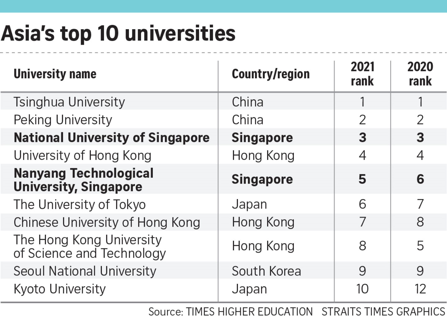 NTU returned to the top five after finishing sixth last year as NUS continued its stay in the top three. Both universities have held top 10 positions since 2015. NTU was No. 5 in 2018.
