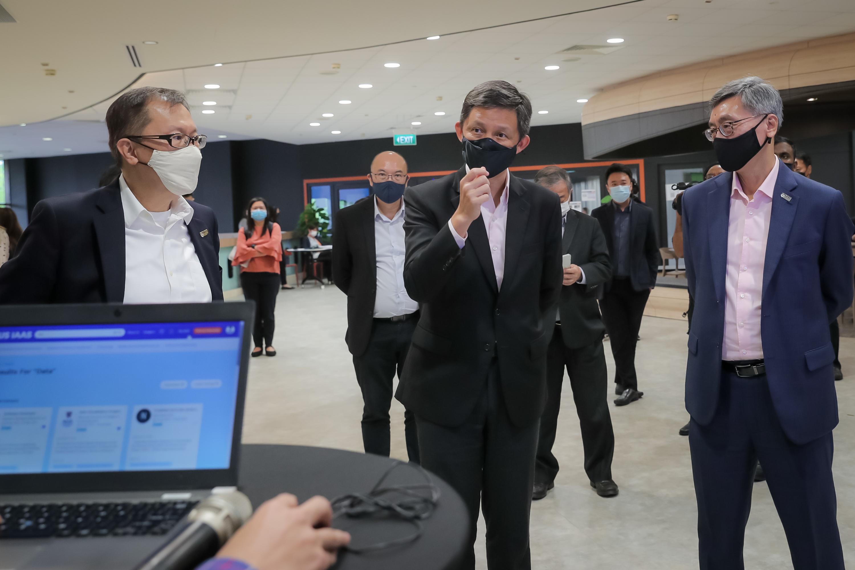 (From left) NUS Provost Professor Ho Teck Hua, Education Minister Chan Chun Sing and NUS President Professor Tan Eng Chye watching a demonstration of the Internship-As-A-Service online platform at i3 at NUS, on Jan 28, 2022.