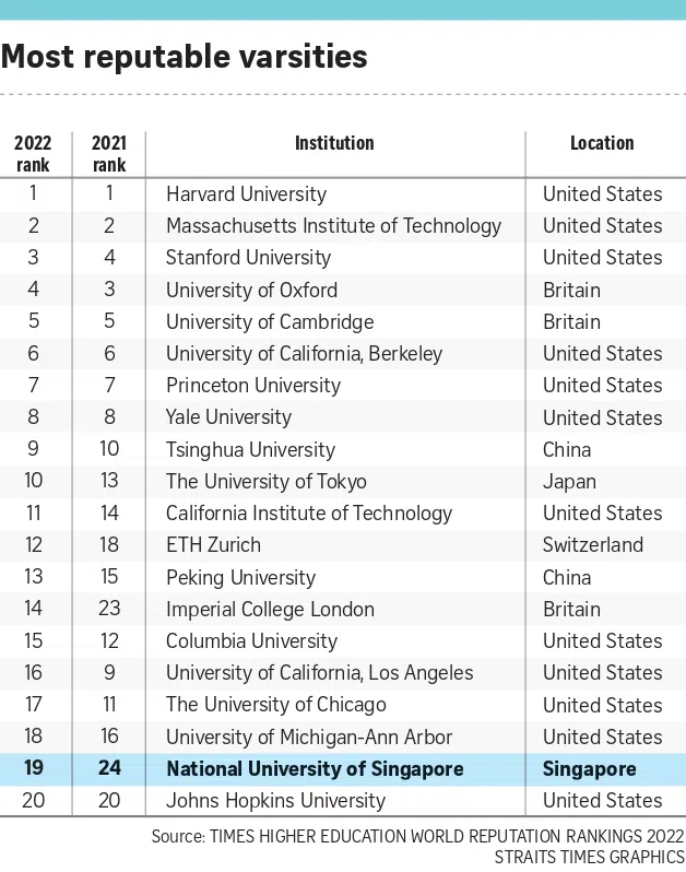NUS climbed to the 19th spot in the Times Higher Education World Reputation Rankings released on Wednesday. It had held the 24th position in the table for the past four years.