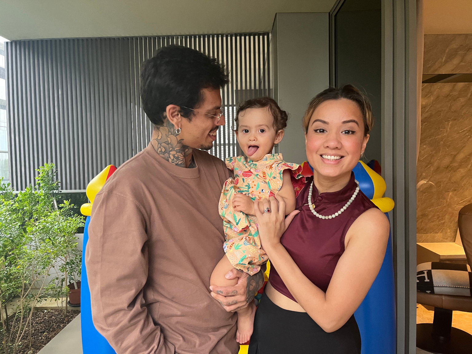 Kiss 92FM DJ Jill Lim (right) with her husband, Mr K.C Meals and daughter Lily Indie Meals.