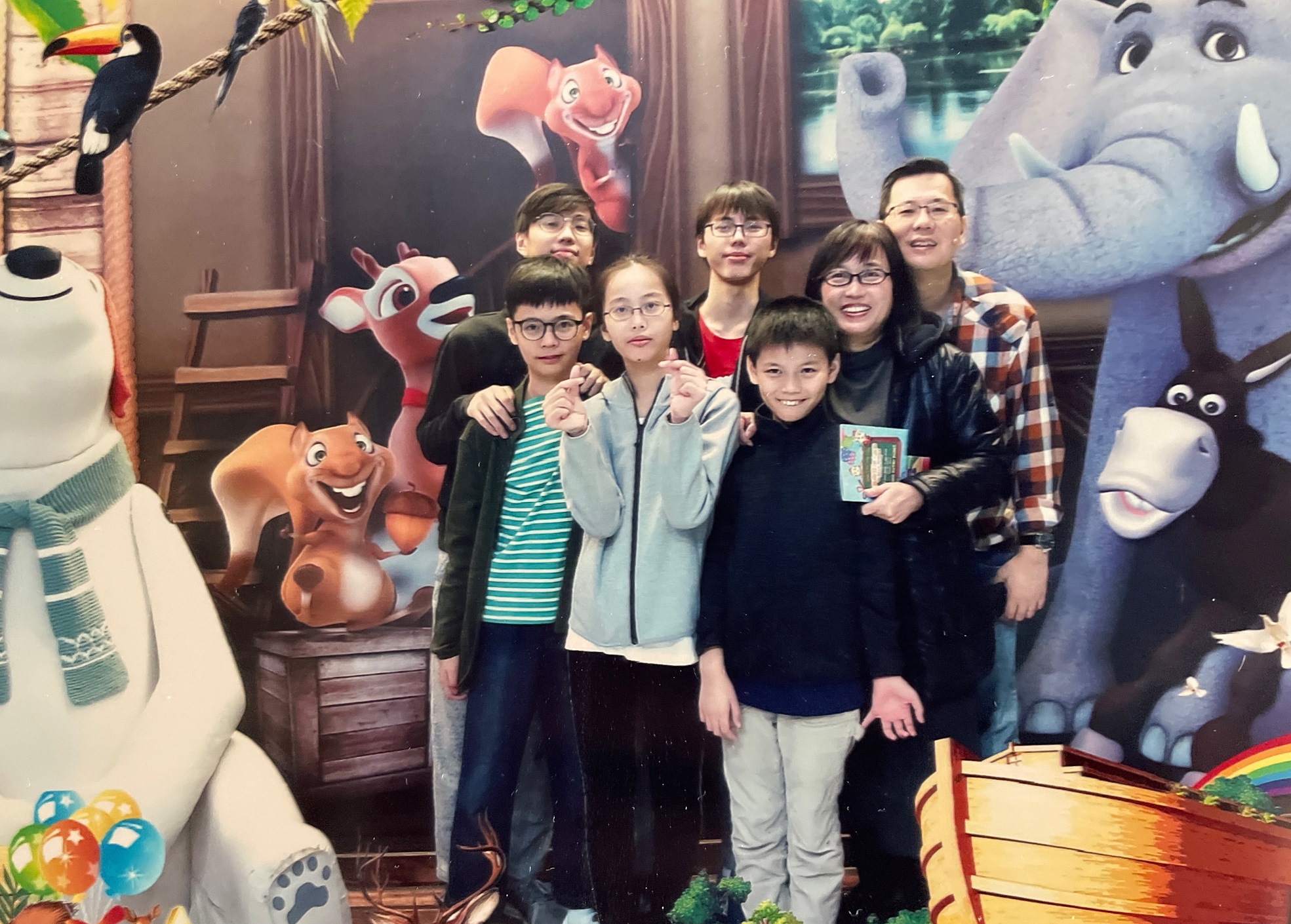 Ms Joey Ching and her husband Mr David Ting (long sleeved checked shirt), with their five children: (back row from left) Ethan, 20, Solomon, 19, (front row from left): Joshua, 15, Sophia, 16, Emmanuel, 13.