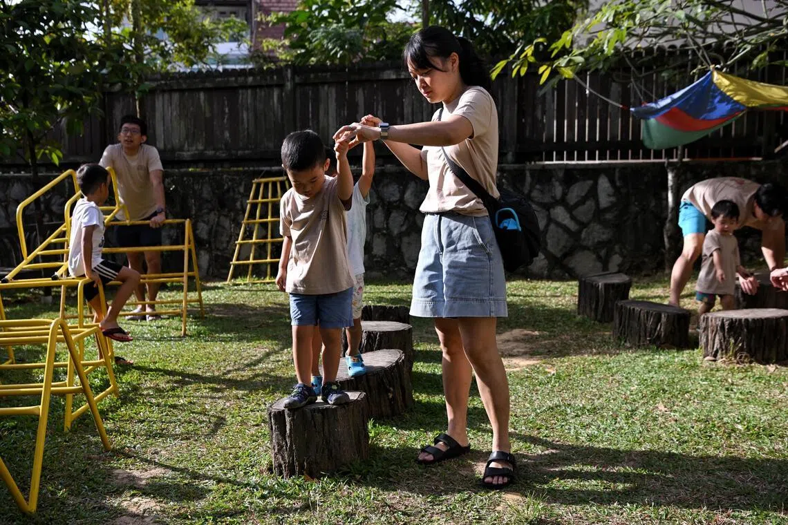 Ms Low Li Ning (centre right), 36, who works in human resources, with her son Liam Yang (centre left) and nephew Lincoln Low (partially hidden), both aged four, in the yard at Pre-School By-The-Park @ Li Hwan during its open house.