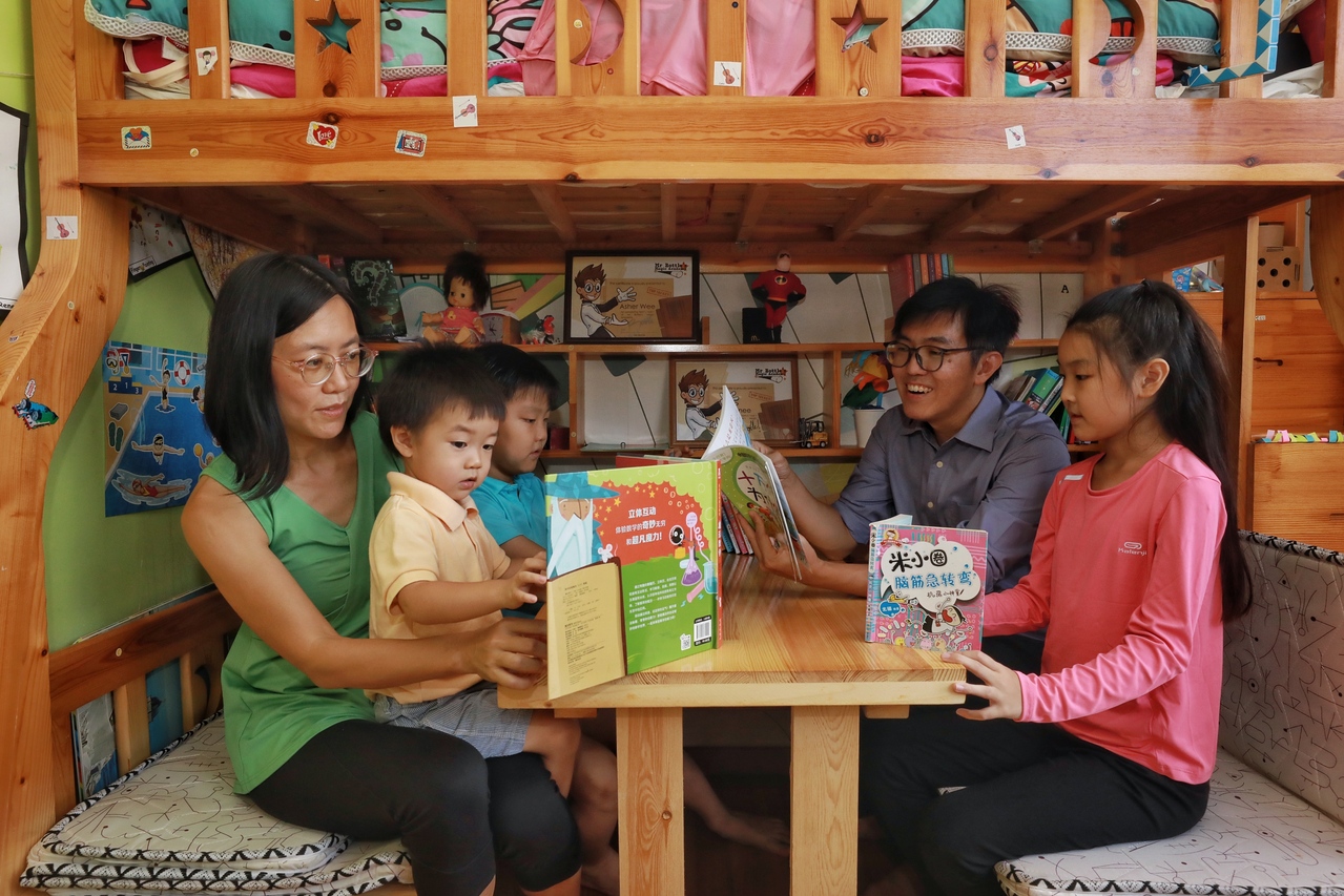Ms May Lau and her husband Wee Kien Meng reading Chinese storybooks with their children (from left) Mark, Asher, and Renee.