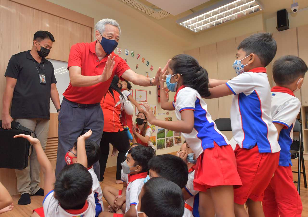 Prime Minister Lee Hsien Loong interacts with children at the official opening of PCF Sparkletots @ Teck Ghee Blk 227.
