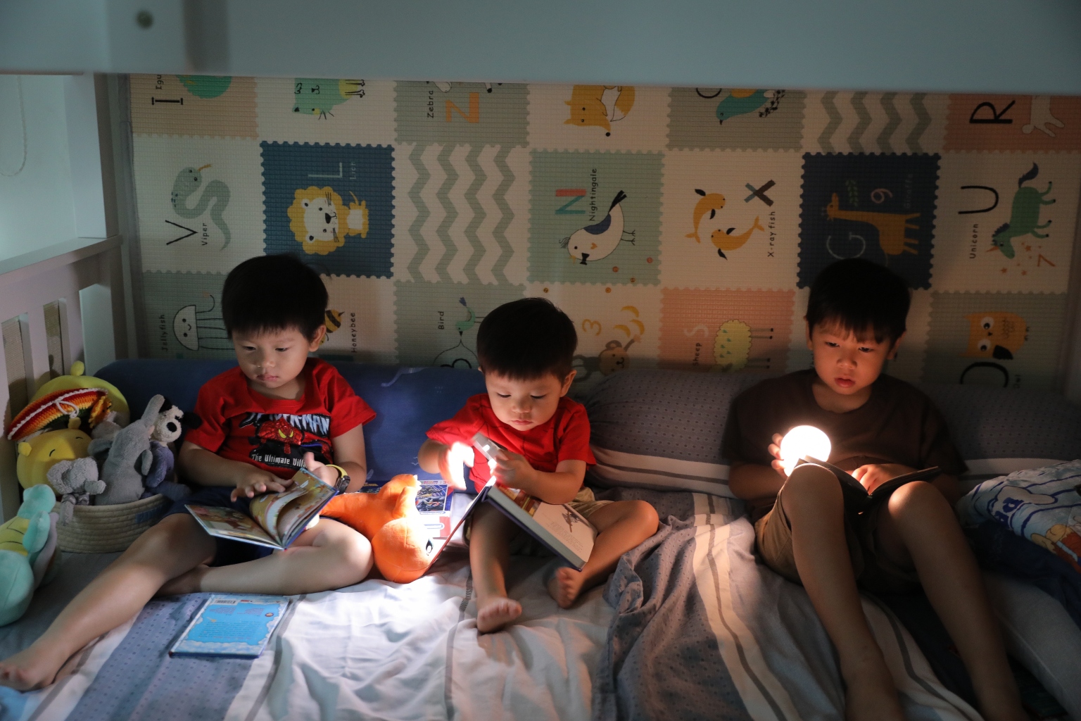 (From left) Brothers Elon, Elias and Edison Toh silent reading before bed time.