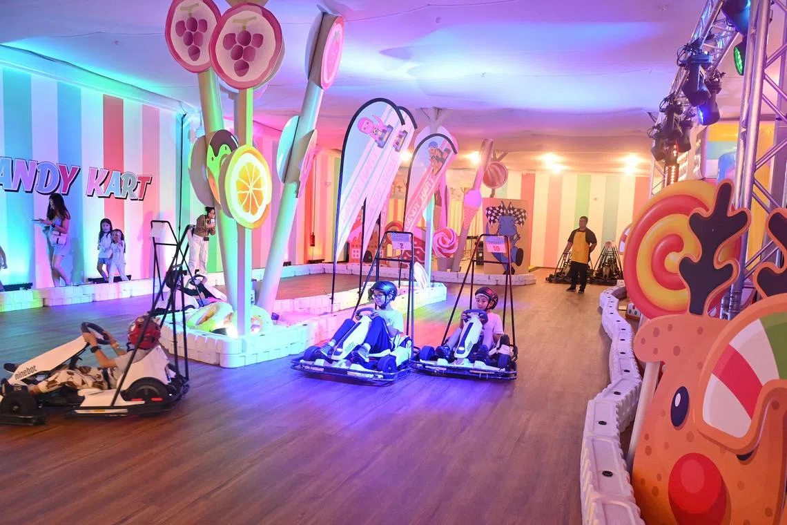 A highlight at the indoor Candy Carnival is a go-kart course for children.