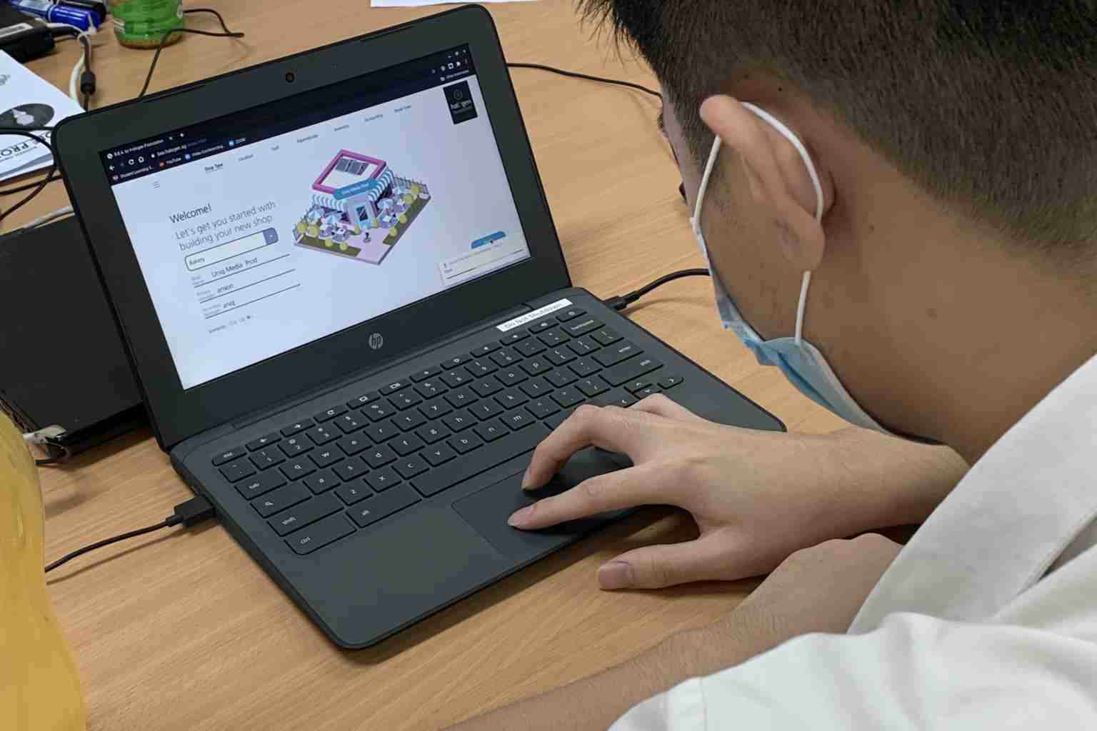 A student using a Web app developed by staff from UBS Singapore.