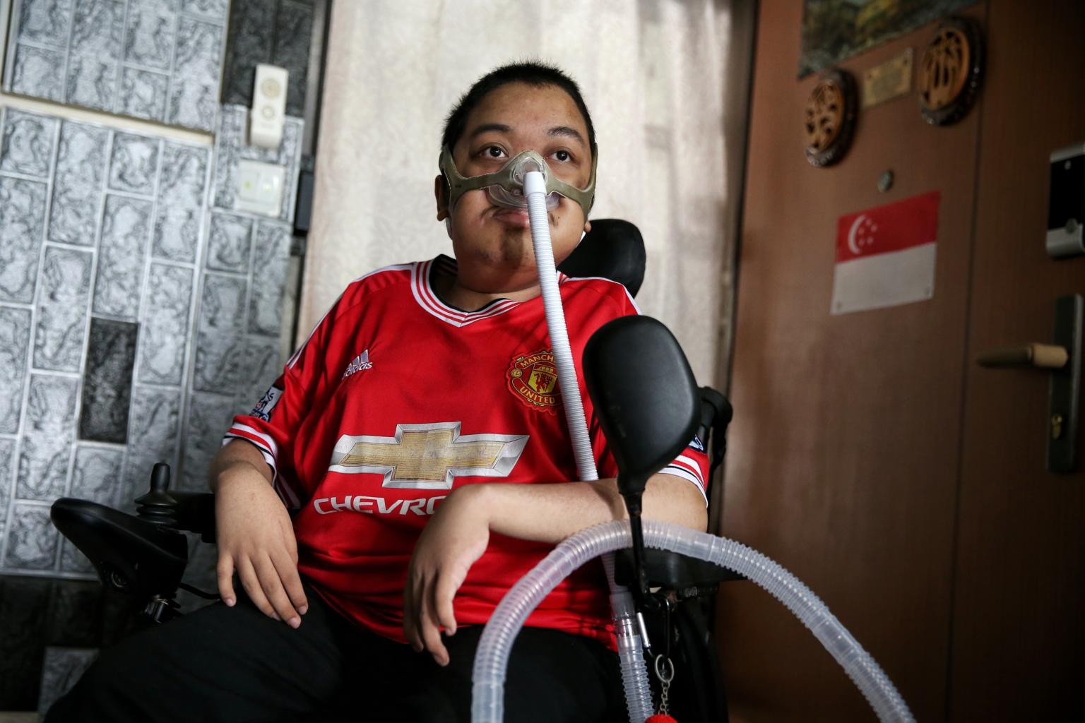 Muhammad Aaron Irwan uses a wheelchair and a ventilator that helps to pump oxygen when he breathes.