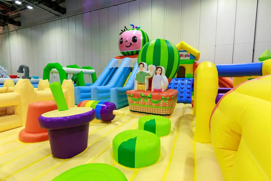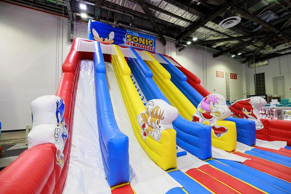 Have fun on CoComelon- and Sonic The Hedgehog-themed inflatables at Kiztopia's Jumptopia Triple Adventure.