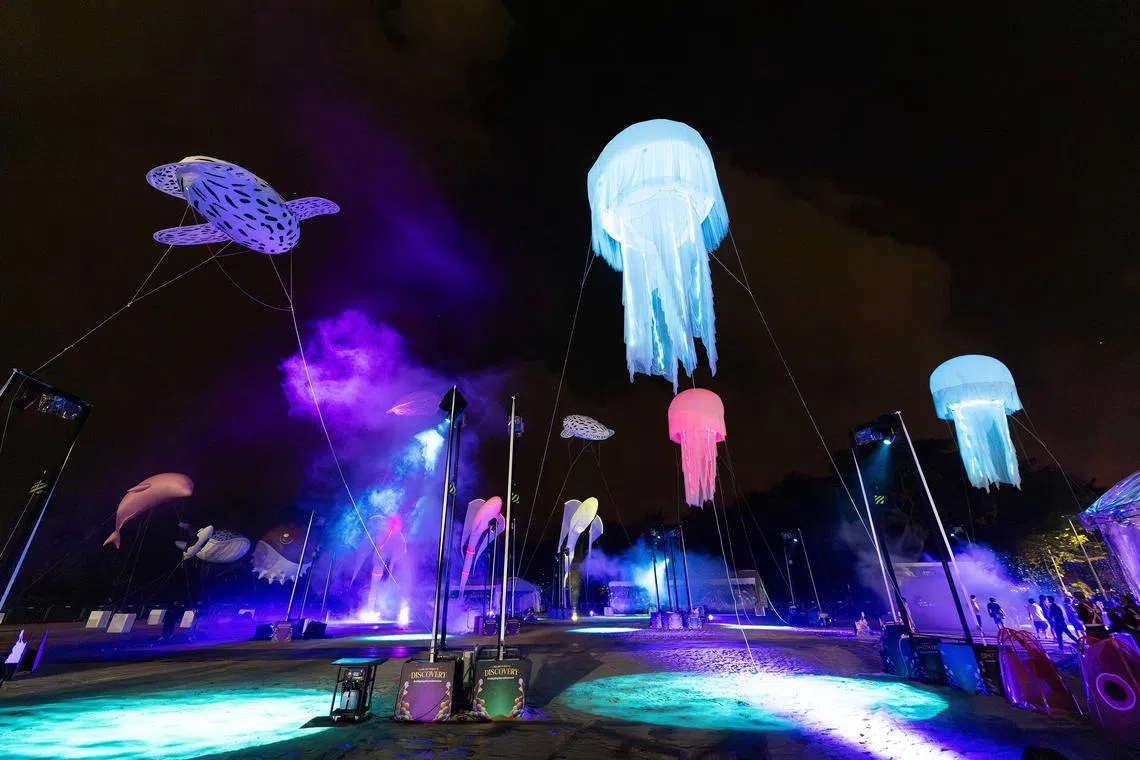 From 8.15 to 10pm during the same period, another set of sea creature inflatables, such as jellyfish, manta rays and whales, will illuminate the sky over Palawan Beach.