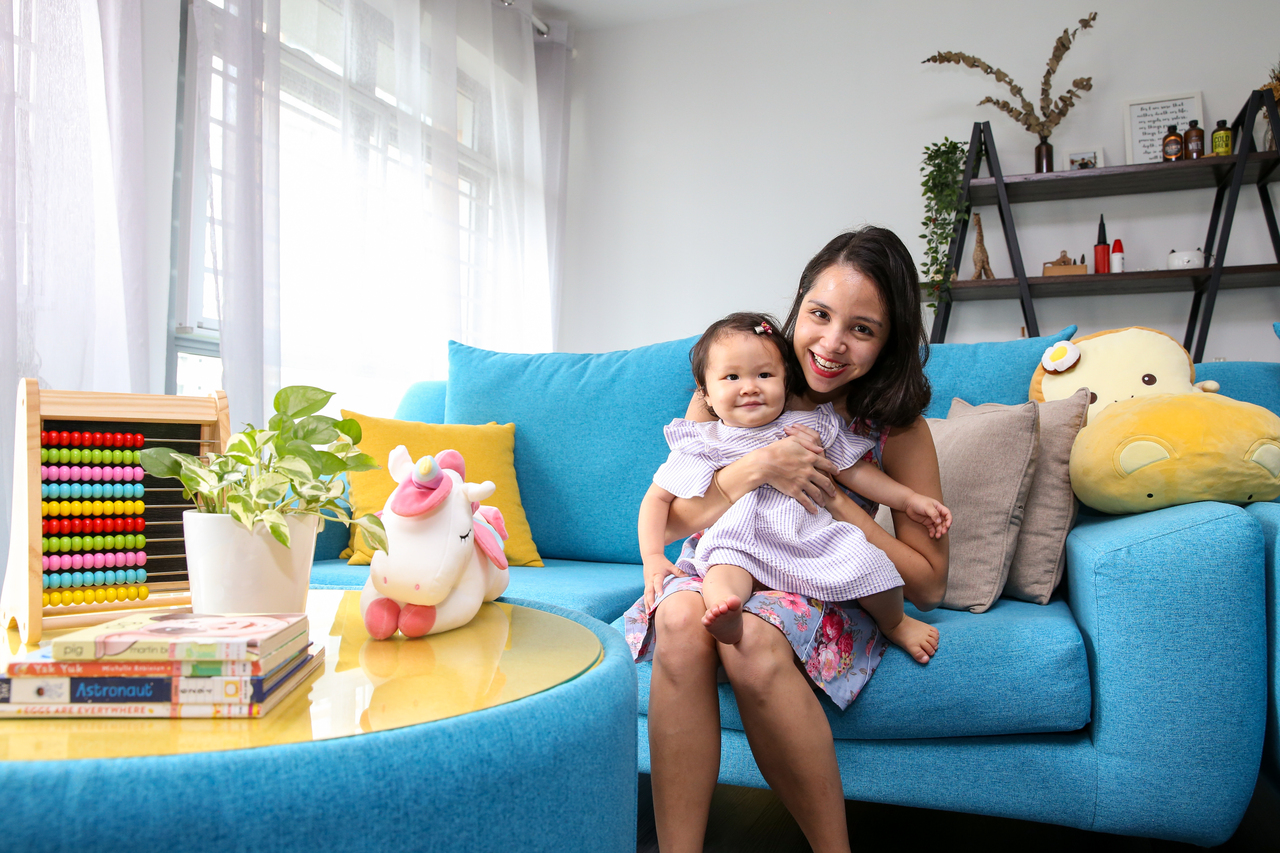 Ms Christel Goh, managing director of GrowPR, and her daughter Fayth Teo, one, in their flat on July 11, 2021.