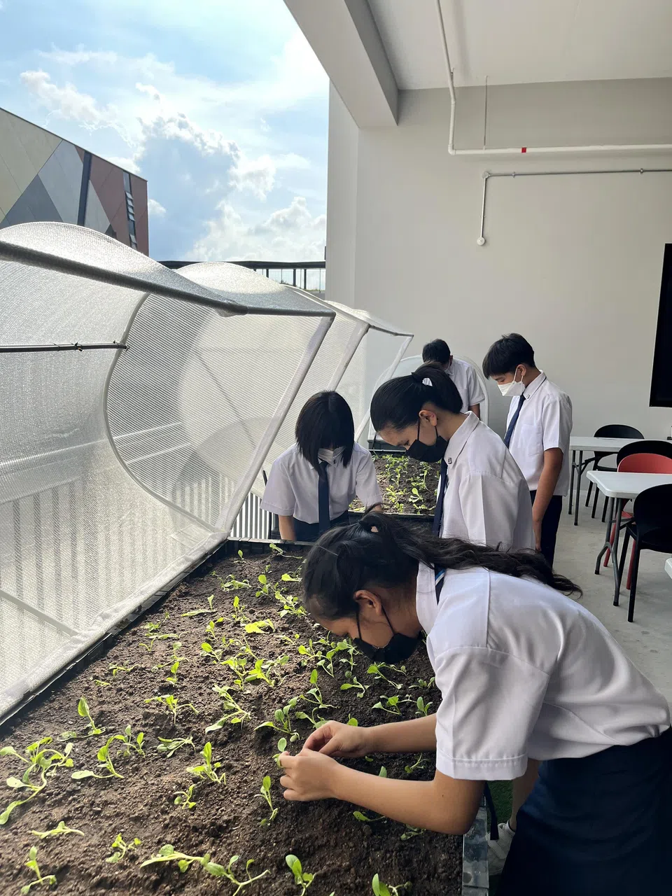 Yusof Ishak Secondary School students trying out urban farming at the school canteen.