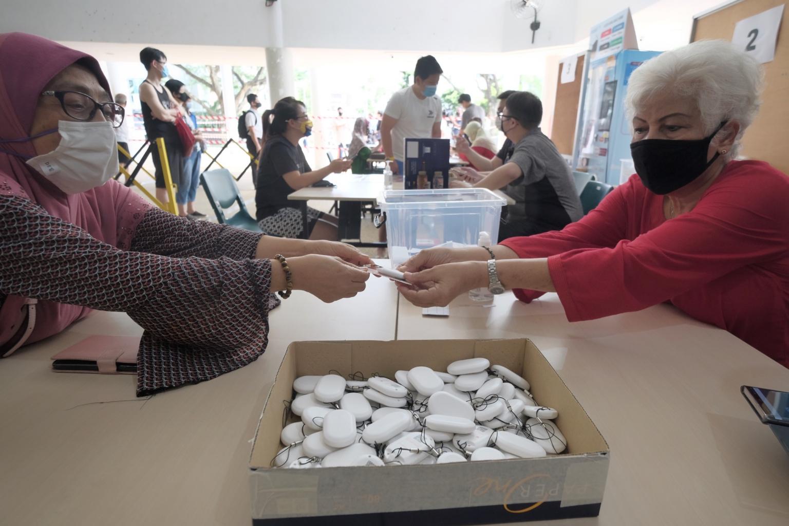Residents collect their TraceTogether tokens at Kampong Kembangan Community Club.