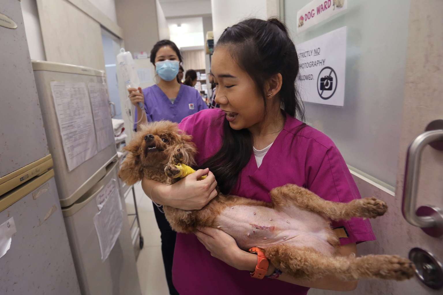 Ms Enrica Cheng carrying a toy poodle back to the ward after its surgery at Allpets and Aqualife Clinic. Ms Cheng, who is studying a Specialist Diploma in Veterinary Clinical Practice, is working at the clinic under the SkillsFuture Earn and Learn Programme (ELP).
