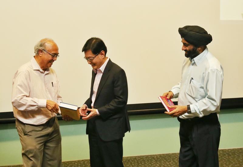 Associate Professor S. Vasoo (left) and Associate Professor Bilveer Singh (right), presenting Deputy Prime Minister Heng Swee Keat with a copy each of the two newly launched books.