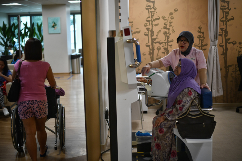 A woman uses one of the four kiosks that allow patients with chronic conditions to check their blood pressure or body mass index (BMI) at Bedok Polyclinic.