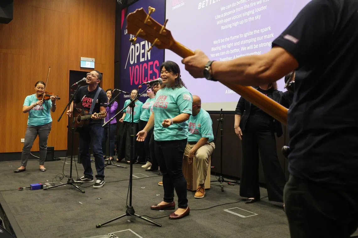 Mr Hazwady Nazran (second from left) and other members of Open Voices performing a song he wrote at the launch of Open Voices.
