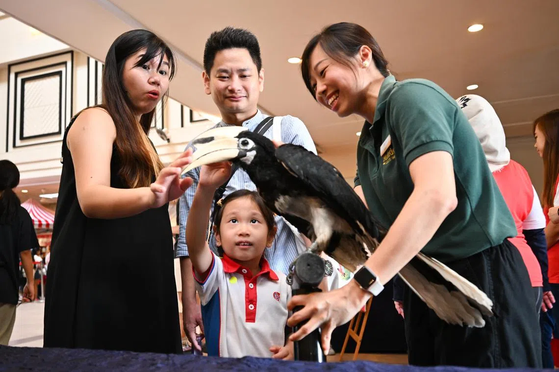 Ms Lee Jing Yi (right), assistant manager at Mandai Wildlife Group, sharing about the Oriental Pied Hornbill with five-year-old pupil Kaelyn Chong and her parents, Mr Terence Chong and Ms Jocelyn Liew.