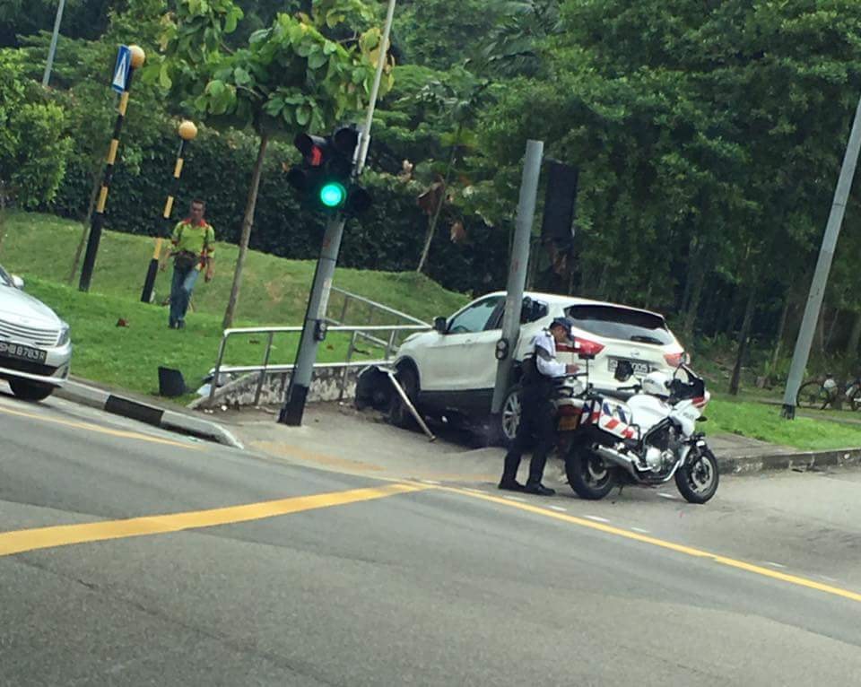 In a series of photos uploaded to Facebook page Singapore roads accident.com, a white car is seen perched on a pedestrian walkway at the junction of Seah Im Road and Telok Blangah Road.