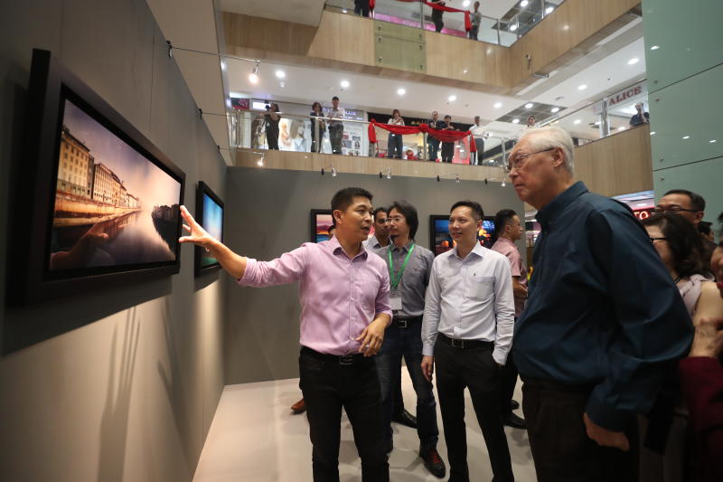 Speaker of Parliament Tan Chuan-Jin introducing a photo to ESM Goh Chok Tong (in blue) at his exhibition titled Our Place in the World.