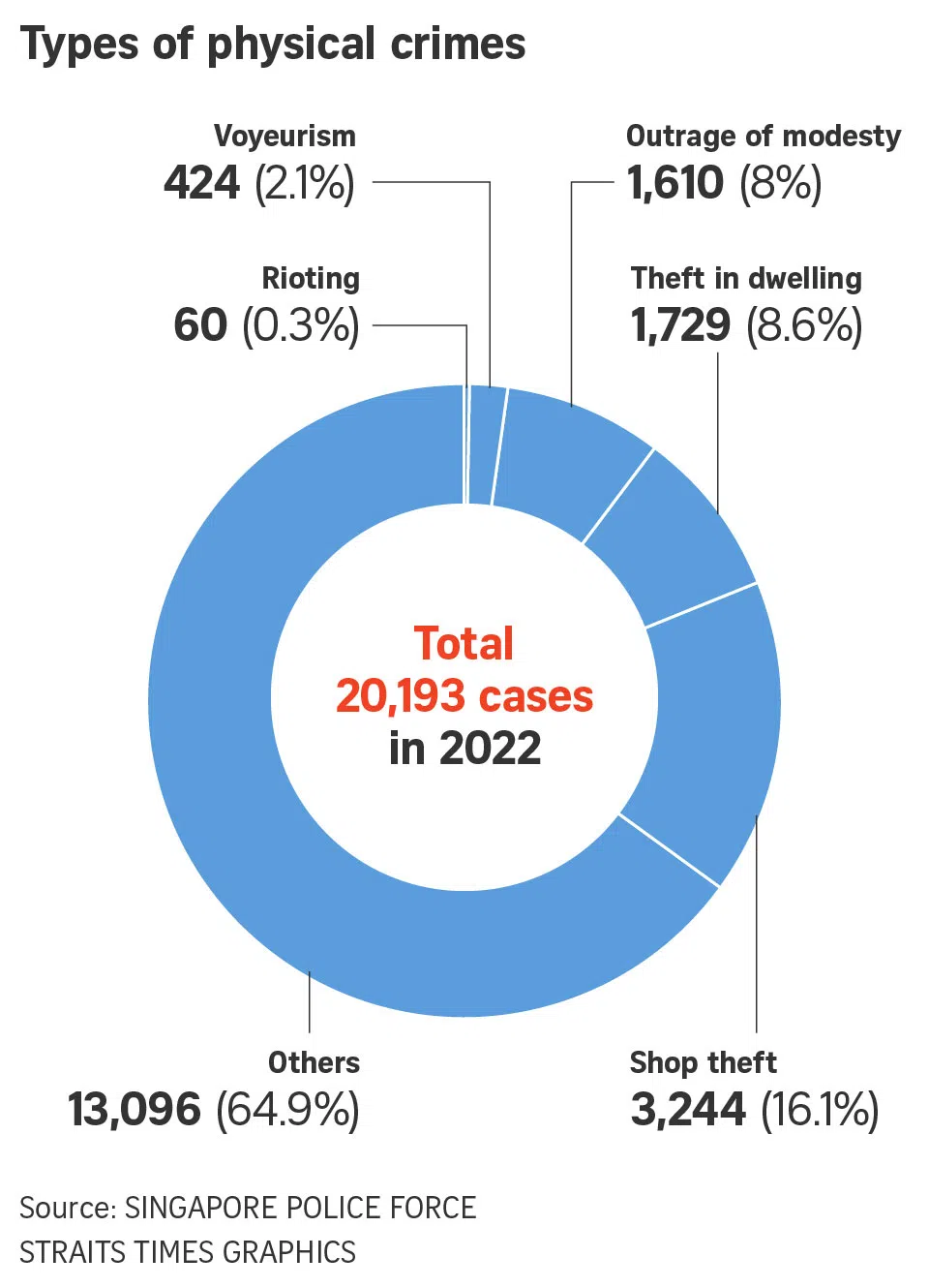 SINGAPORE – There was an increase in physical crime in Singapore in 2022, with a total of 20,193 reported cases, up from 19,343 in 2021.