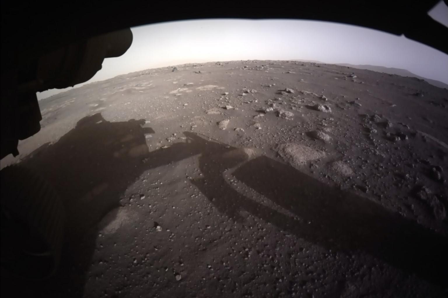A view from the Perseverance rover, without a protective cap over the camera’s lens.