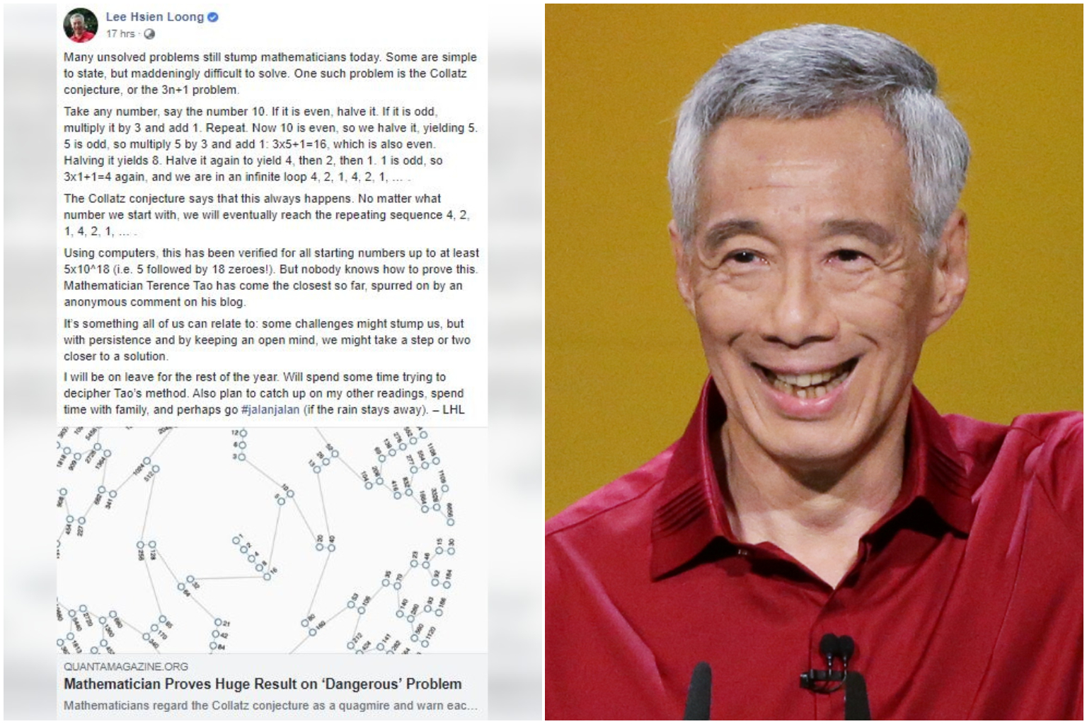 SINGAPORE - Prime Minister Lee Hsien Loong announced on Friday (Dec 20) that he will be on leave from Dec 21 to Jan 3. During this time off, besides plans to spend time with family and "perhaps go #jalanjalan", he said he will also be looking at an unsolved mathematical problem called the Collatz conjecture and mathematician Terence Tao's method to prove this.