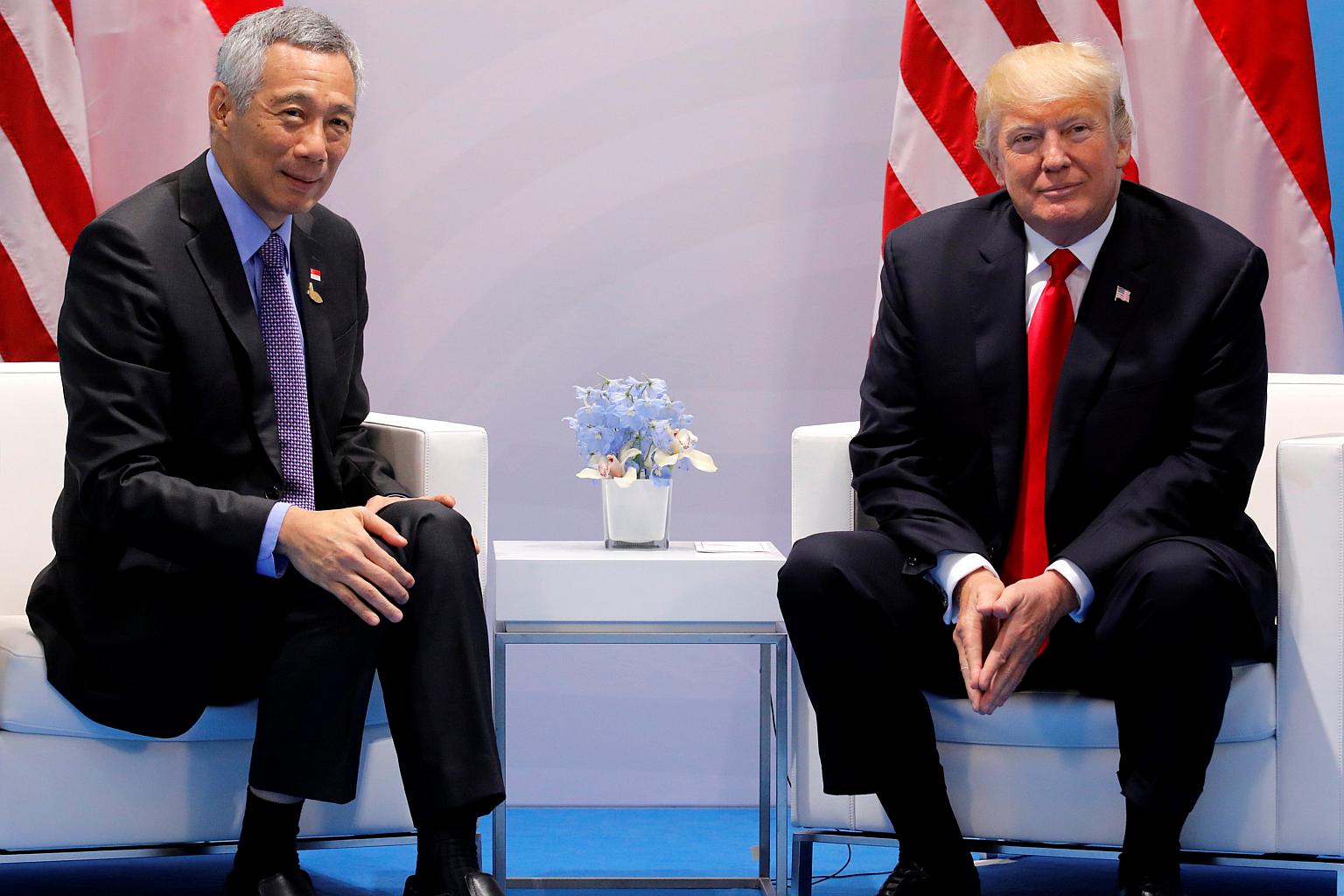 Singapore's Prime Minister Lee Hsien Loong talks with US President Donald Trump during the G-20 leaders summit in Hamburg, Germany, on July 8, 2017.