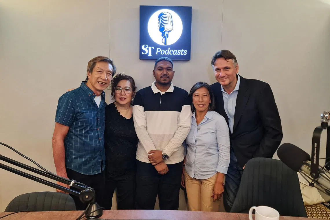 ST Podcast’s Hard Tackle host Deepanraj Ganesan (centre) with (from left) kayaker Stephenie Chen’s parents Michael Chen and Sarah Yvonne, and (right) kitefoiler Maximilian Maeder’s parents Hwee Keng and Valentin Maeder.