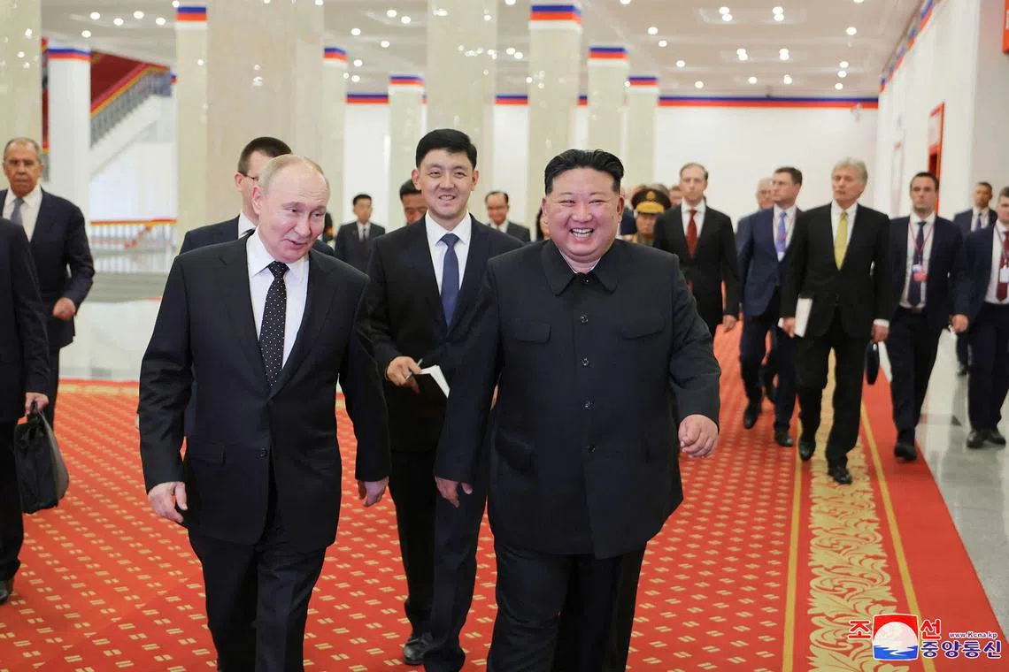 North Korea’s leader Kim Jong Un and Russia’s President Vladimir Putin after watching the welcome performance at the Pyongyang Gymnasium in Pyongyang.