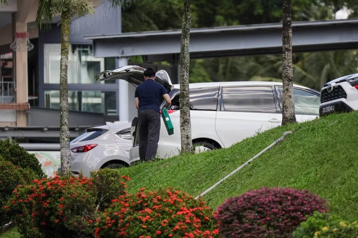 At about 1.45pm, a handcuffed man wearing a blue top was led to a white multi-purpose vehicle (MPV) by police officers. Investigators wearing gloves were seen examining the driver’s seat and contents in the boot. Close to 3pm, plainclothes officers were again seen checking the boot of the MPV.