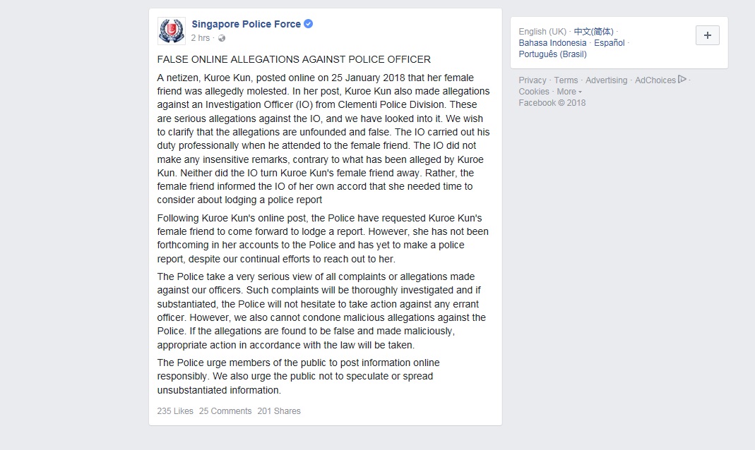 In a statement on Facebook, the police noted that the netizen, who goes by the name Kuroe Kun, had posted online that her female friend was allegedly molested on Jan 25.