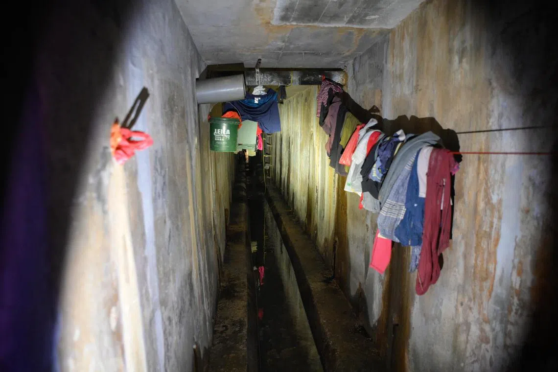 Metal steps inside the drain led The Straits Times into a labyrinth of dark passages. About 10m in, ST spotted damp clothes hanging on a nylon string and a single mattress on a makeshift bed comprising wooden planks.
