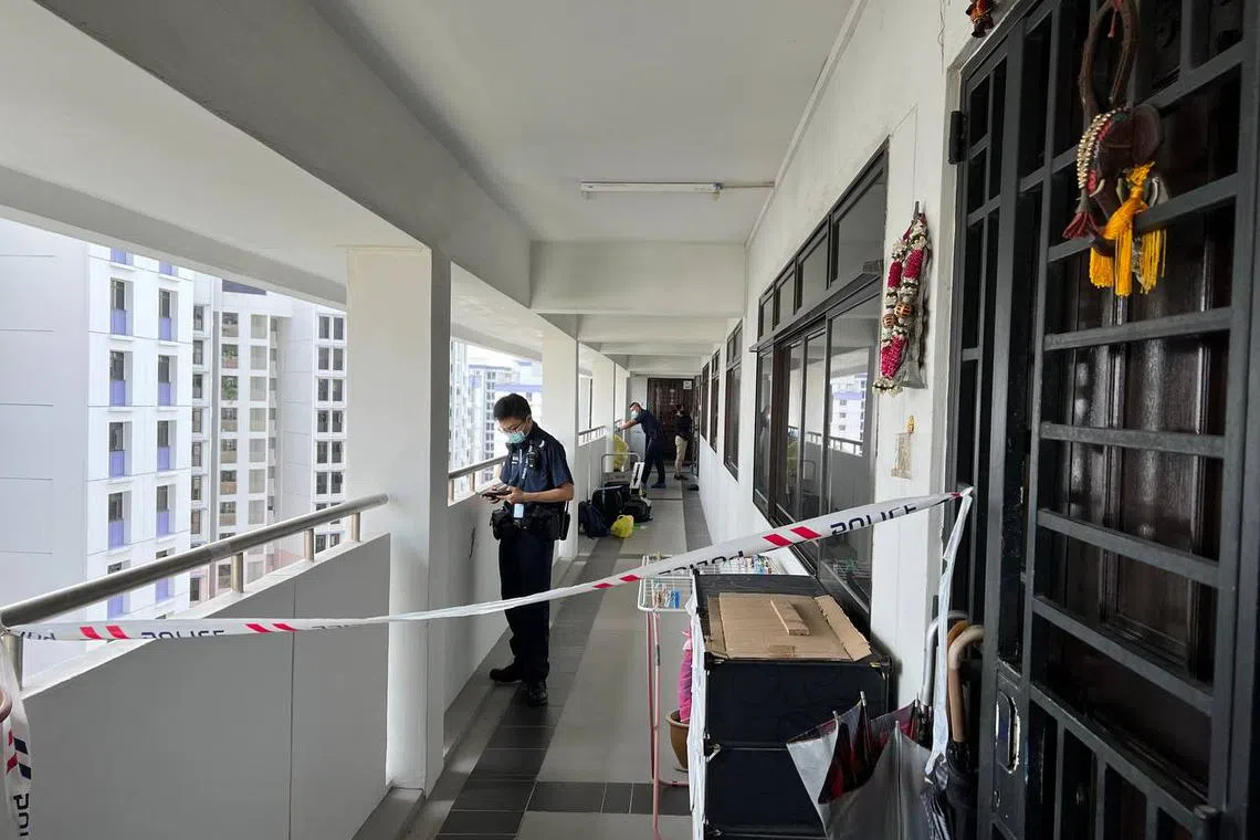 A police cordon was set up outside a 15th-storey flat in the Housing Board block, with police officers seen speaking to neighbours.