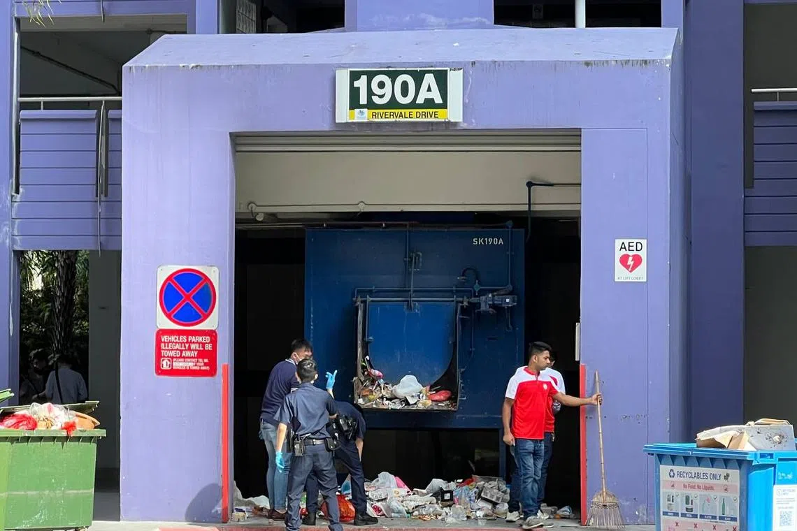 When The Straits Times arrived at the block at around 9am, five police vehicles, including three cars and a forensics van, were parked in the vicinity of the Housing Board block. Three policemen were seen raking through the trash at the rubbish chute on the ground floor with the help of three cleaners.