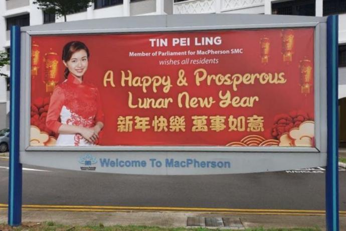 The original banner bears a greeting by Ms Tin, wishing residents "a happy and prosperous Lunar New Year" in English and Chinese, alongside a photo of her in a red and white outfit.