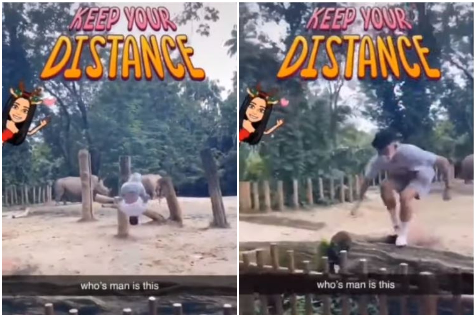 Videos being circulated show the man doing a backflip inside the enclosure with the rhinos, before leaping over the barricade and back onto the visitors' footpath. Four rhinos can be seen inside the enclosure.