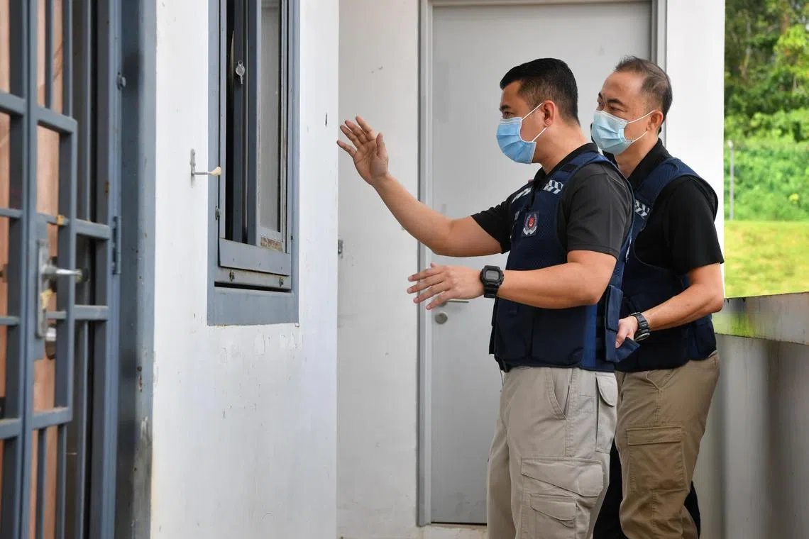 CNU officers talk to a man who has locked himself at home during a training simulation of a stand-off situation at the Home Team Tactical Centre.
