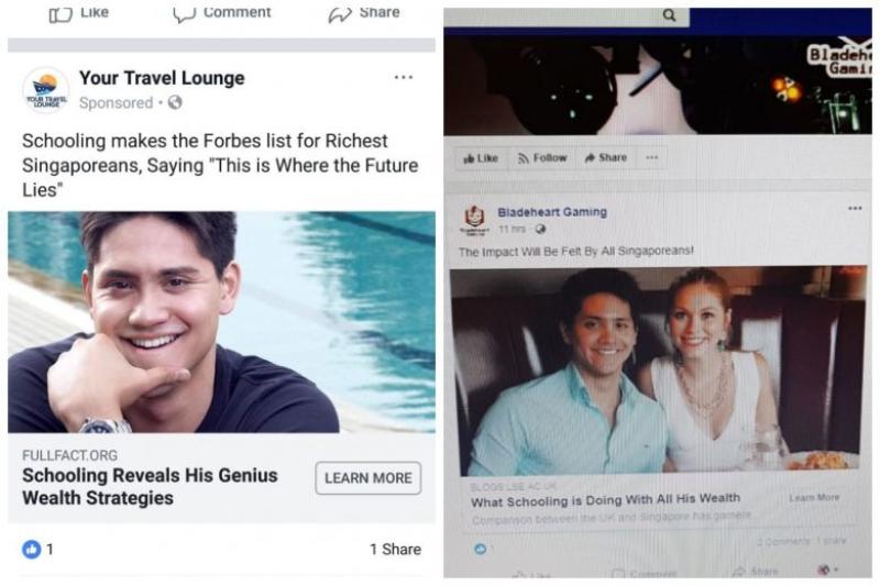The ads on Facebook have headlines such as "Schooling Reveals His Genius Wealth Strategies" and "What Schooling Is Doing With All His Wealth", as seen in screenshots sent to The Sunday Times by Ms Ng Doswell.