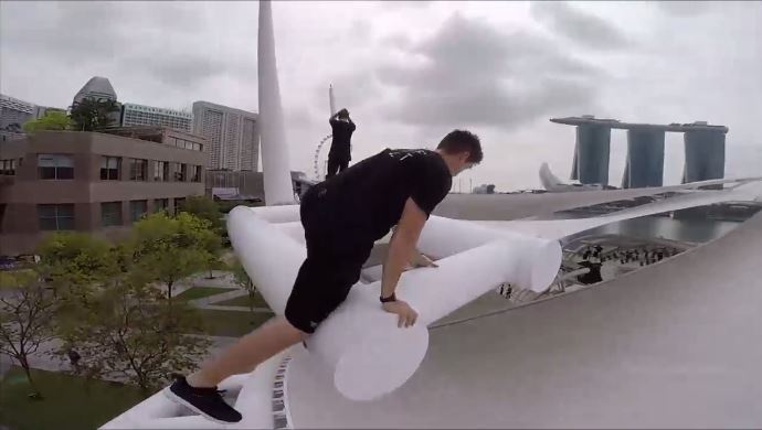The video also shows them jumping across a sizeable gap between two flyovers located near the Esplanade as a crowd of onlookers film them from below.