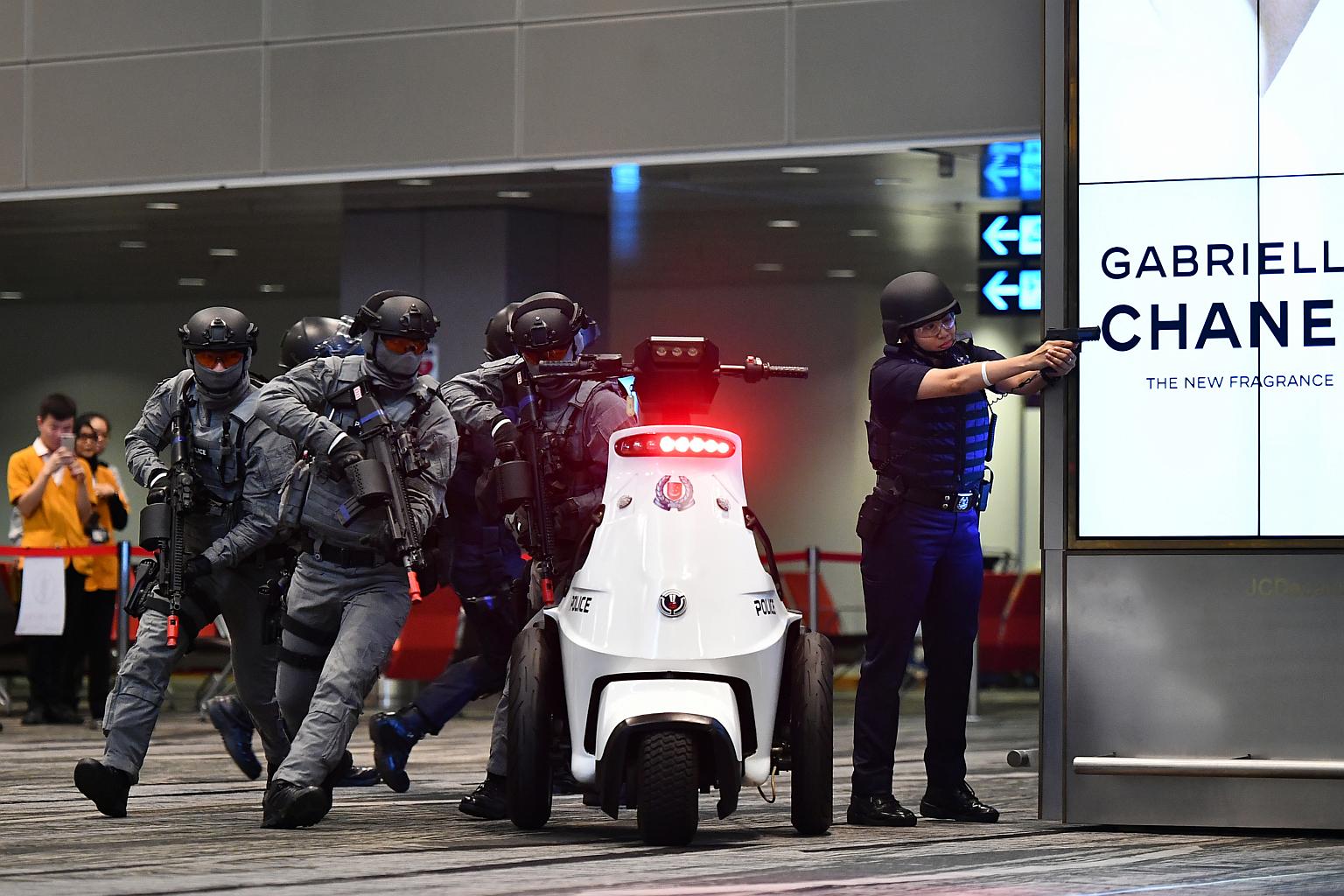 A Ground Response Force (GRF) officer (extreme right) from the Airport Police Division (APD) responding to a threat. The Rapid Deployment Troop (RDT) from the Special Operations Command (SOC), and police specialist officers also move in to respond to the threat.