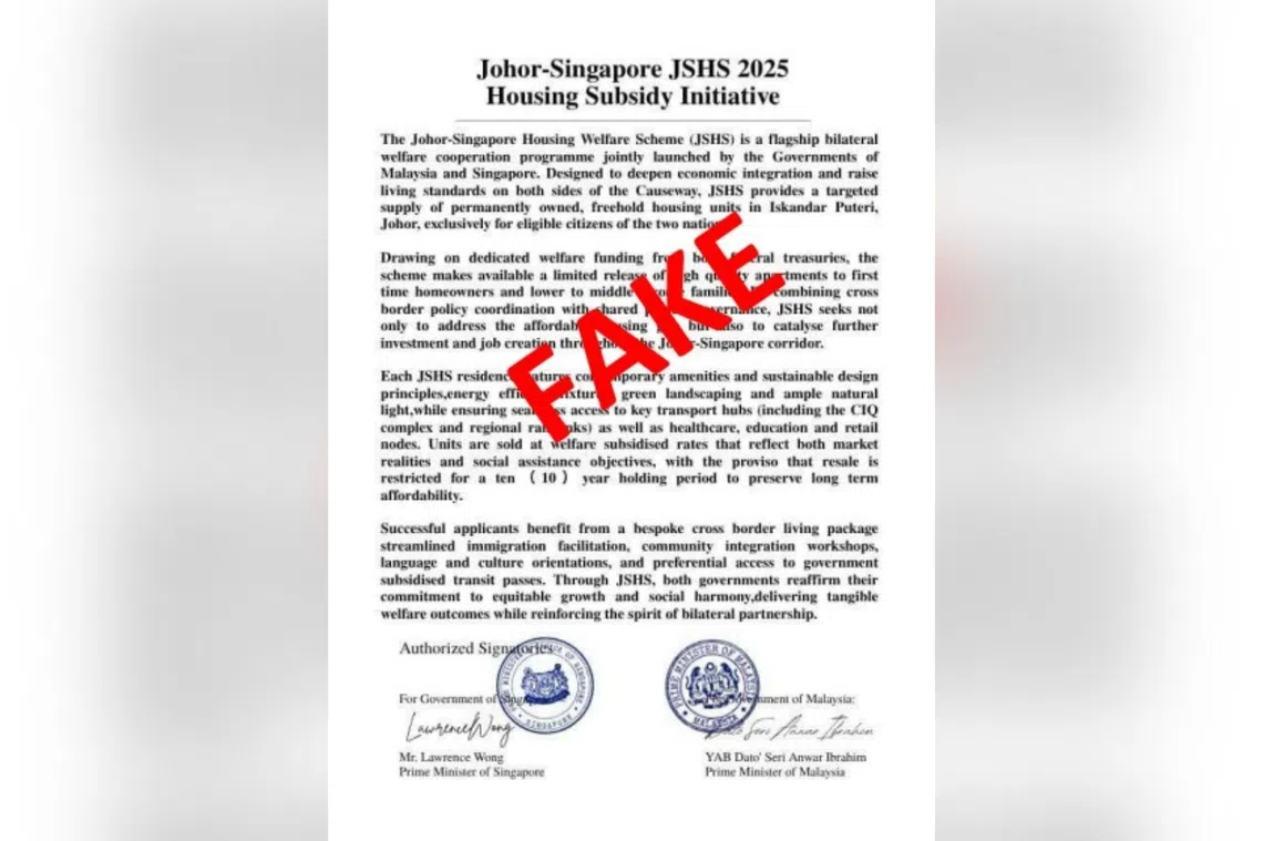 In this scam variant, victims would come across advertisements such as “JBSG Housing Subsidy Program” or “Free Homes Across the Causeway” on online platforms, such as Facebook, about an alleged collaboration between the Singapore and Johor governments to provide subsidised housing, said the police in a statement on Sept 4.