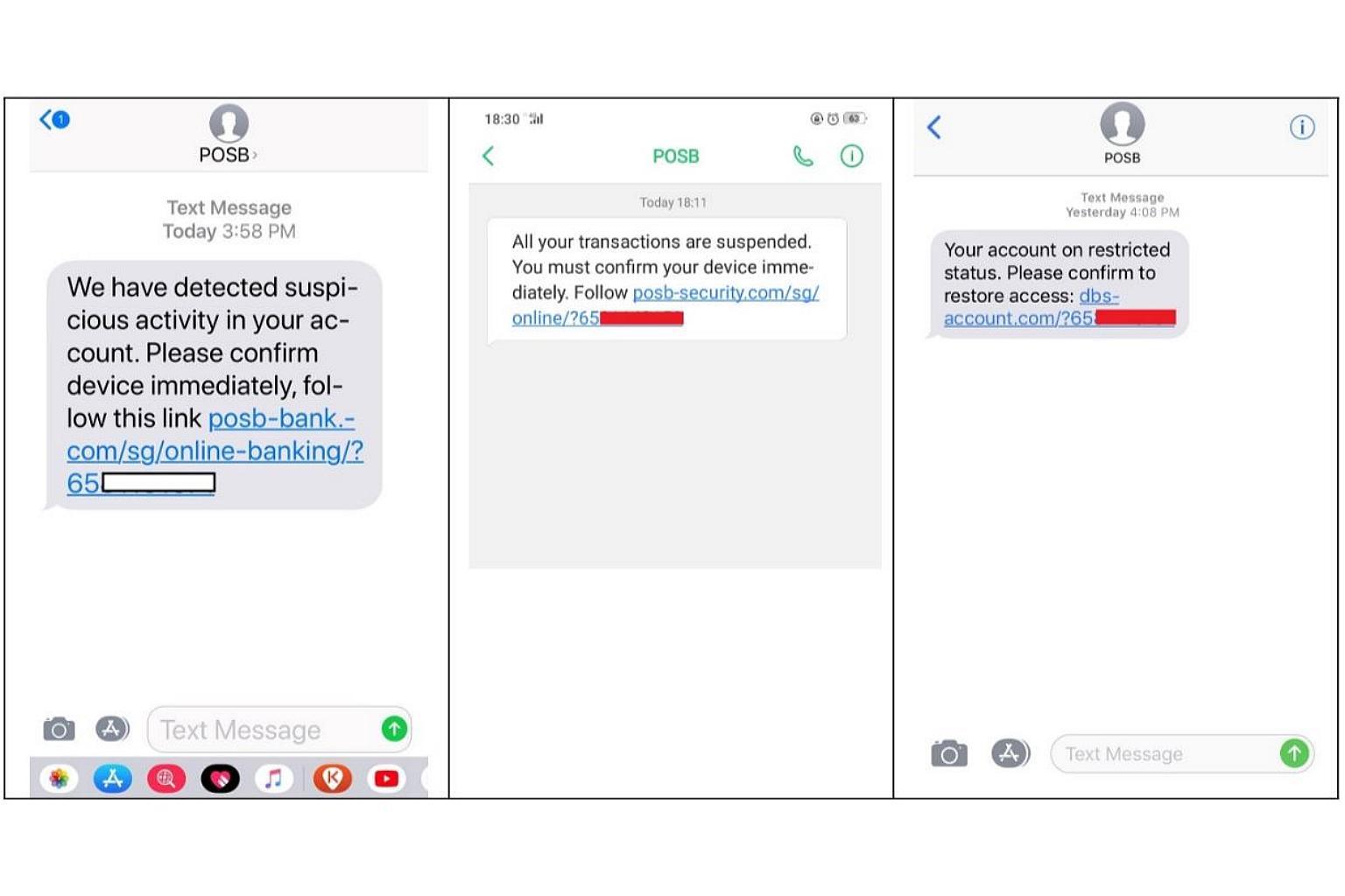 Bank customers who clicked on the links in the SMS were redirected to a non-DBS website, such as posb.validation-details.info, dbs.account-access.info or posb.account-certification.in.