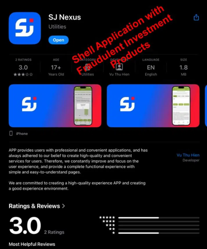 Applications used to peddle fraudulent investment products. seen on an app store