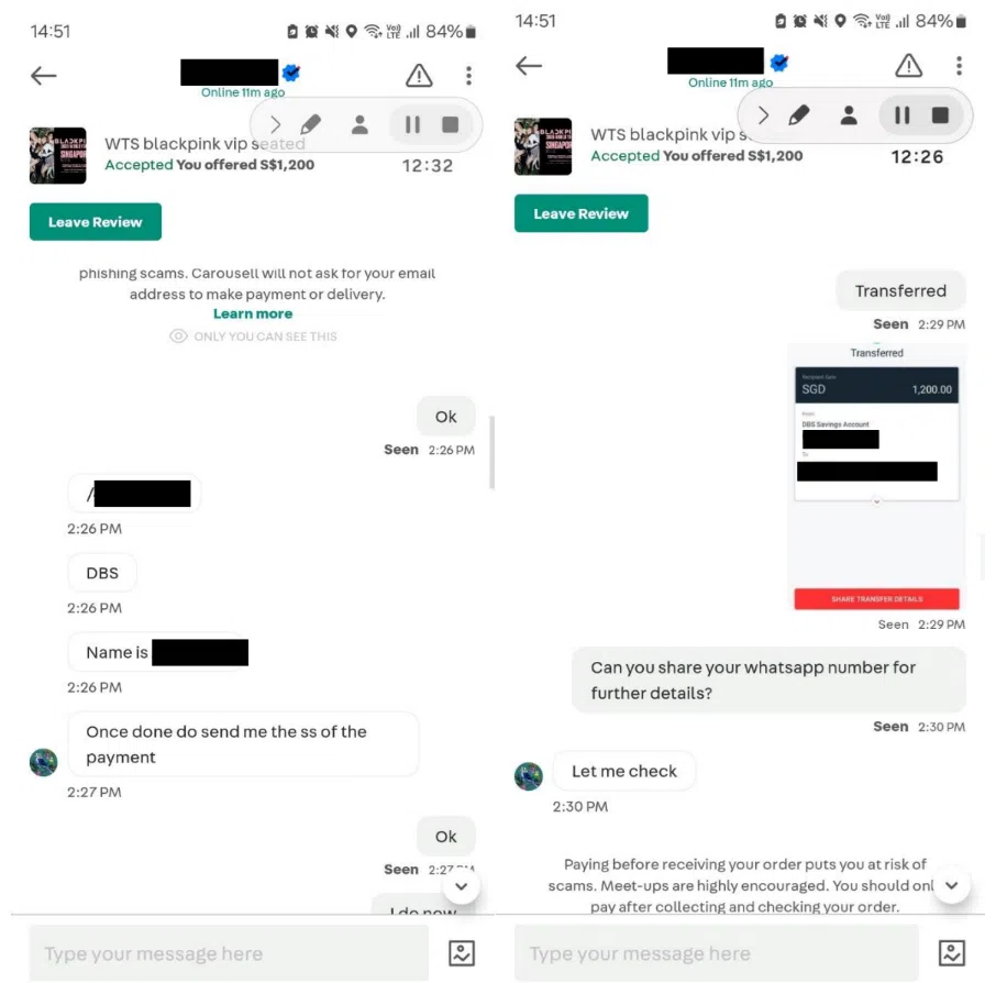 In such scam variants, victims would come across sale offers for concert tickets on messaging or social media platforms such as Telegram, Carousell, X, Xiaohongshu and Facebook.