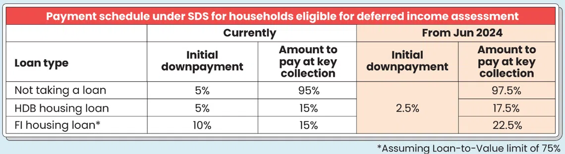 Previously, the upfront down payment under the Staggered Downpayment Scheme had already been halved to 5 per cent for buyers taking HDB loans and those without a housing loan, and 10 per cent for buyers opting for bank loans.