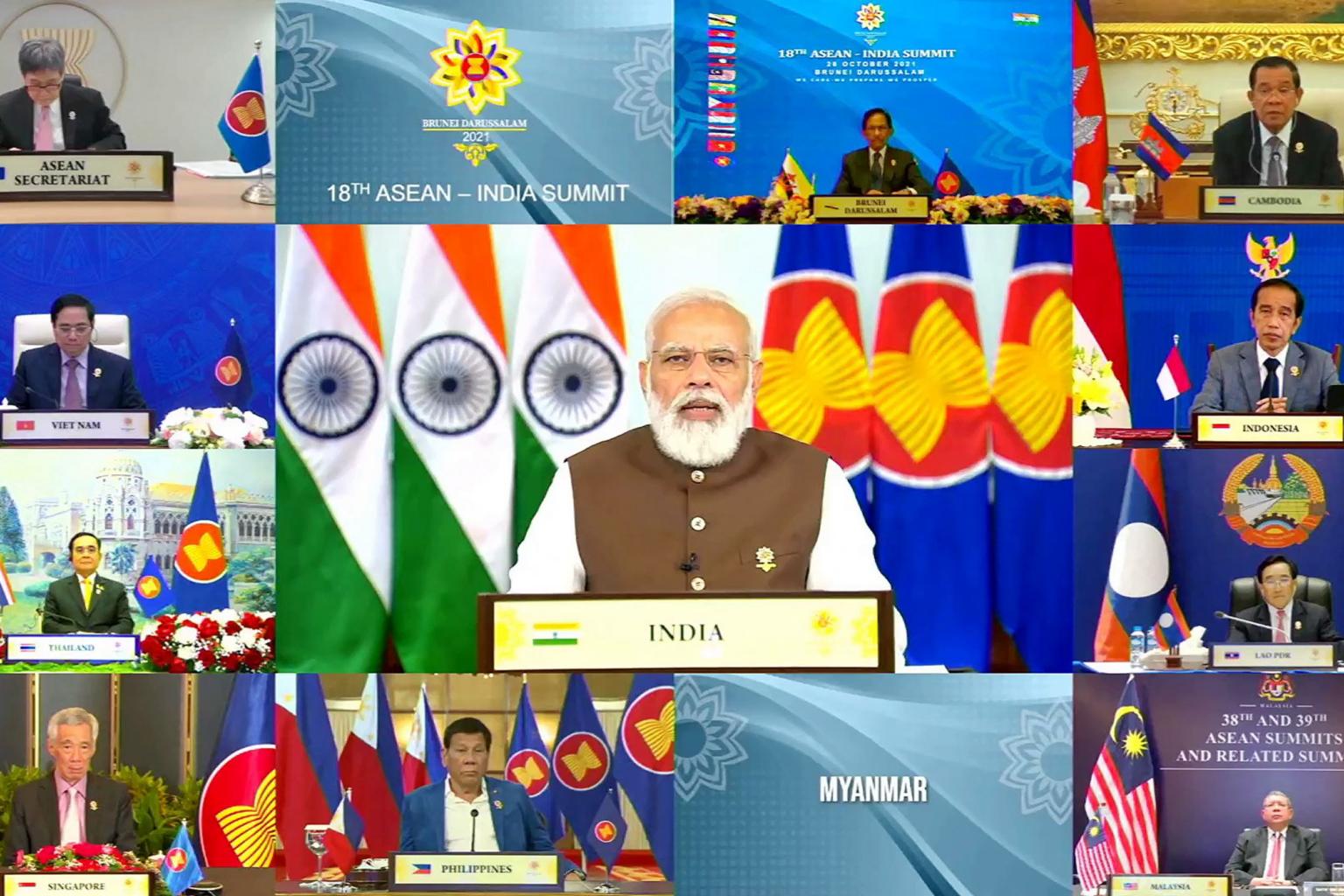 Indian Prime Minister Narendra Modi (centre) taking part in the Asean-India Summit held in Brunei, on Oct 28, 2021.